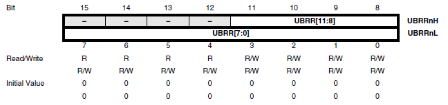 UBRRn est le registre qui définit le baud rate et comporte 12 bits. Les 4 premiers bits sont dans UBRRnH, tandis que les 8 restants sont dans UBRRnL. La valeur écrite dans UBRRn dépend de la fréquence d'horloge du processeur et du baud rate souhaité.